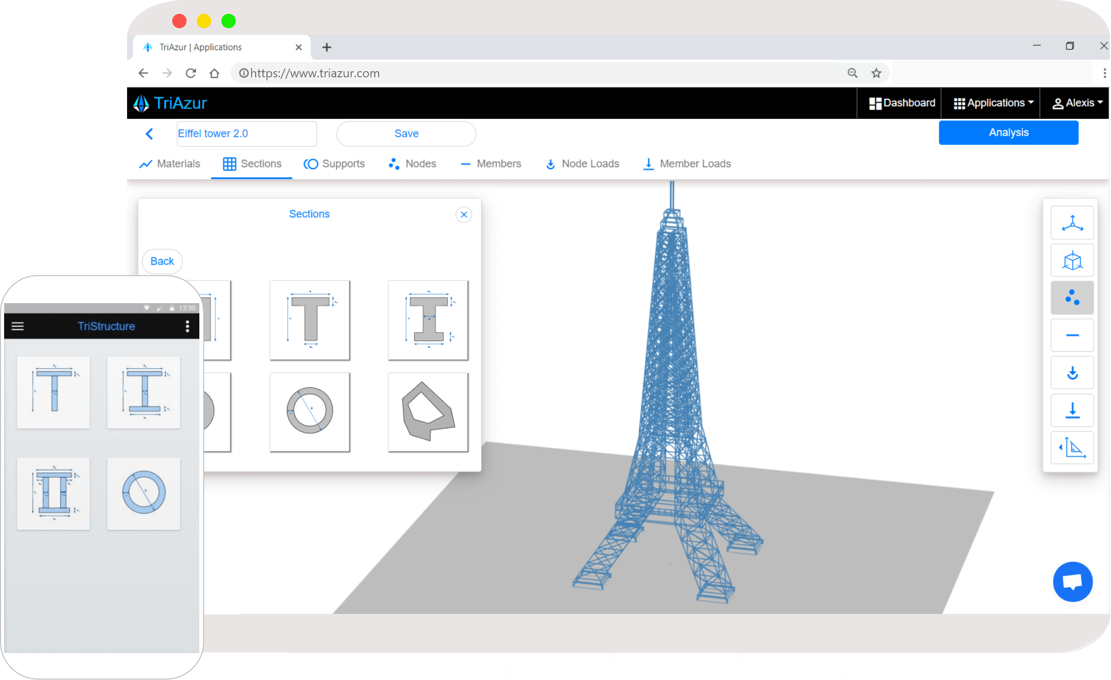 Structure 3D permet, via une interface 3D, de calculer les sollicitations et les déplacements d'une structure soumise à des efforts extérieurs directement dans votre navigateur.